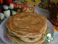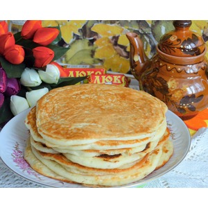 Печь блины по 1,5 -2 минуты с каждой стороны. Горячий блин смазать топленым маслом. Выход 10 блинов, 18 см. |