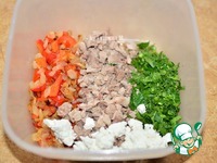 Соединить жареные овощи, утиное мясо, рубленную зелень и брынзу, при надобности подсолить и посыпать перцем по вкусу. |
