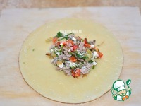 На поверхности разложить блин жареной стороной вниз, дать остыть, в середину выложить начинку. |