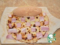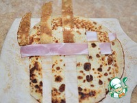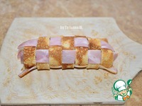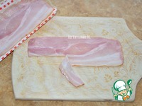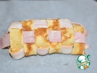 Блин положить на поверхность, нарезать на такие же полосы, что и бекон, не дорезая блин с одной стороны. Заплести в блин беконные полосы в шахматном порядке. |