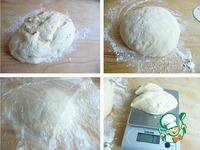 Готовое тесто выкладываем на припорошенный мукой стол, обминаем, накрыть пленкой и оставить на 10-20мин., разделить на равные кусочки. |