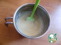 Греем молоко до тёплого. Я взяла 70 мл молока и разбавила его 30 мл горячей воды. Отправляем к муке и хорошо растираем смесь. Я пользуюсь всегда силиконовой лопаткой. |