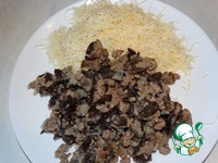 Для начинки мы обжариваем лук, грибы и фарш. Трем сыр, перемешиваем все вместе. |