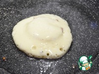 Разогреть сковороду, налить масло, ложку теста, на тесто кружок паштета. |