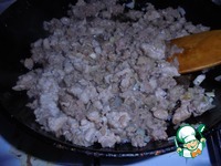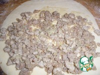 Подошедшее тесто раскатать (оставить немного теста для украшения кулебяки). Выложить на тесто мясную начинку. |