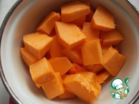 Тыкву почистить, порезать кубиком и отправить в кастрюлю, налить туда немного воды, поставить на небольшой огонь и варить до мягкости. Нам нужно 400г уже очищенной тыквы. |