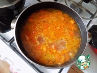 Разливаем суп по тарелкам и выкладываем в тарелку порезанное мясо индейки. |