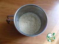 Половину муки просеиваем в смесь. Соединяем и ставим в тепло на 15 минут. Я для этого грею духовку немного. |