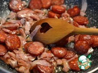 Колбасу нарезать на кружочки. Добавить к бекону и обжарить. Не стараемся жарить до корочки, просто слегка обжарим. |