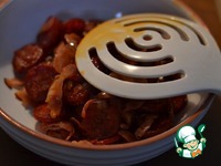 Шумовкой выкладываем бекон и колбасу в отдельную миску, стараясь весь жир оставить на сковороде. Он нам еще пригодится. |