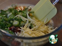Добавить мелко нарезанный лук, 2/3 тертого сыра, бекон и колбасу. Аккуратно перемешать лопаткой. |