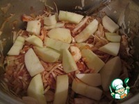 К готовой и немного остывшей начинке добавить нарезанный кубиками сыр, яйца разболтать со сметаной и хорошо перемешать с начинкой. Выложить начинку на тесто и выпекать пирог примерно 40 минут. |