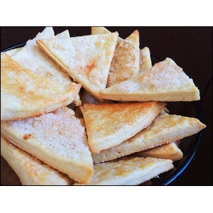✔ Раскатать тесто, с помощью ножа для пиццы разрезаем на треугольнички и ромбики. ✔Отдельно в мисочку отправляем оставшийся белок от теста и отдельно сахар, около стакана. ✔Противень посыпаем мукой и каждый треугольничек смазываем белком и обсыпаем сахаром. Выпекать до золотистого цвета при 180С.