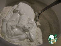 Пока опара поднимается, смешать пшеничную муку, сметану, размягченное масло и взбитый белок. |