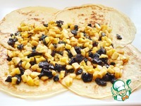 Количество блинов, которое вы будете использовать, смотрите по ситуации. Их может уйти 4,6 или 8 штук в зависимости от диаметра и толщины. Положите блины внахлёст, на них выложите начинку |