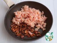 На сковороду добавить куриный фарш, добавить бульон (1/2 стакана или воду). Смесь посолить, добавить черный молотый перец по вкусу. |