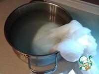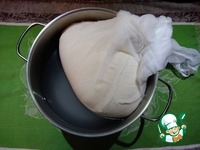 Тесто кладем в мешок из марли (сложить вдвое и сделать запас для подъема теста). Наливаем в большую кастрюлю с толстыми стенками теплую воду около 40°. |