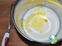 В другой миске смешиваем жидкие составляющие: молоко, горячую воду, яйцо, растительное масло. Температура должна быть 30-40 градусов. |