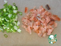 Берём филе копчёной красной рыбы, у меня балык кеты, режем очень мелкими кубиками. Также режем колечками зелёный лук. |