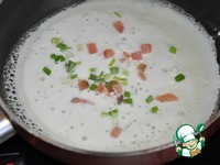Берём сковороду, для удобства выпечки взяла небольшого диаметра. Смазываем нагретую сковороду маслом, наливаем половником тесто, сразу же сверху посыпаем кусочками копчёной рыбы и зелёным луком. |