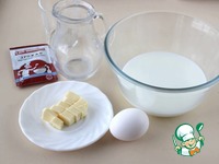 Смешать молоко с водой и подогреть в микроволновке 20 секунд до теплого состояния. Добавить яйцо, сахар, щепотку соли, нарезанное на кусочки сливочное масло. |