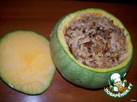 Выкладываем в тыкву начинку из мяса, лука, и тыквы. |