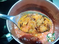 Рис с грудинкой перекладываем к томатам. Теперь нужно добавить лук, морковь, чеснок. Варим 5-7 минут. |