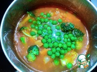 Добавляем соцветия брокколи и зеленый горошек (предварительно размороженный). Варим еще 7 минут. Накрываем крышкой, убираем с горячей плиты. Пусть настоиться и немного остынет. |