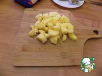 Картофель режем небольшим кубиком и отправляем в кипящую смесь рыбного бульона и сливок. |