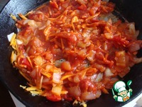 Лук, морковь, болгарский перец измельчить и обжарить на сковороде с подсолнечным маслом. Добавить помидор и томатную пасту. |