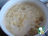 После того, как закипит горох, снимаем пену и сразу закладываем капусту. Минут через 20 добавляем картофель, зажарку. |