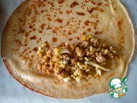 Берем готовые блины и кладем по ложке с горкой начинки и сворачиваем их |