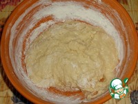 Насыпаю муку, тесто получается густое. Ставлю в тепло примерно на 1 час. |