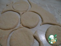 Подошедшее тесто раскатываем на столе, подпыленном мукой, в большой пласт толщиной 1/2 см. Выемкой или стаканом нарезаем кружки, которые слегка раскатываем скалкой |