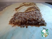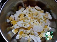 Потом по тому же принципу слой грибов, потом яйца. Каждый слой закрываем блинами. |