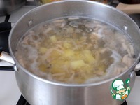 Добавить в кастрюлю с грибами картофель, нарезанный кубиками, 5-6 горошин душистого перца, варить 5-10 мин. |