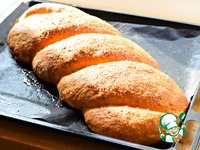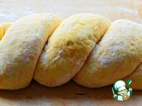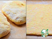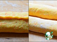 Тесто выложить на рабочую поверхность, слегка присыпанную мукой, обмять, разделить на две равные части. Каждую раскатать в пласт размером примерно 15х40 см, толщиной 5-7 мм. |