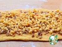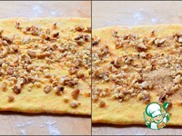 Отступив от краев по 1,5-2 см, равномерно разложить на каждую часть орехи. Сверху присыпать сахаром. Мы не любим слишком сладкую выпечку. А сладкоежкам советую количество сахара увеличить... |