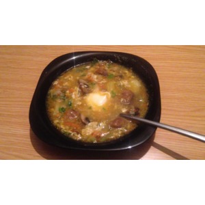 Грибной суп с яйцом. Обжарил крупно порезанные шампиньоны на растительном масле. Добавил лук, тертую морковь, томатную пасту. Потушил до полу-готовности. В кипящую воду добавил рис. Минут через десять грибы с овощами и порезанную картошку. В готовый суп добавил зелень и специи