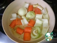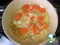Лук мелко нарезаем, морковь - колечками. В сковороду где обжаривались овощи добавляем немного растительного масла и тушим на ней морковь с луком до прозрачности лука и средней мягкости моркови. |