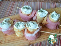Нанизать на шпажки, обвивая "змейкой" блинчик полоской мяса. Выложить на каждый рулет сметану. Приправить зеленью. |
