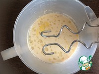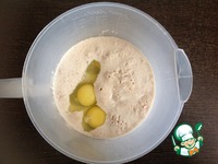 В чашу миксера вылить закваску, добавить оставшийся сахар и яйца. |