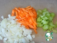 Сначала готовим зажарку. Овощи моем, чистим. Морковь режем соломкой, лук мелкими кубиками, сельдерей полосками. |