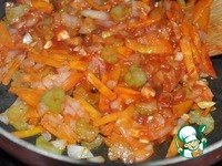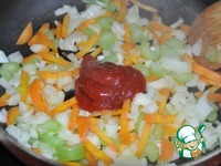 Обжариваем овощи на смеси сливочного и растительного масла около 5 минут на среднем огне. Добавляем томатную пасту. |
