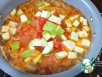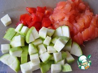 Режем кубиками кабачок (молодой), болгарский перец и помидоры. |