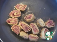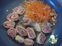 Лук и морковь добавляем к рулетикам. Обжариваем 5 мин. Рулетики переворачиваем, зажарку перемешиваем. И обжариваем еще 5 мин. |