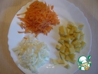 Лук и картофель режем кубиком. Морковь трем на терке. Картофель забрасываем в кипящий бульон. |