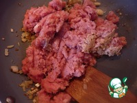Выкладываем на сковороду фарш. Солим и обжариваем, измельчая комочки. Тушим 5 мин. |