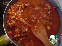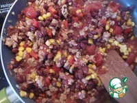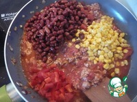 Добавляем вареную фасоль, кукурузу и кубики сладкого перца. Тушим 5 мин. |
