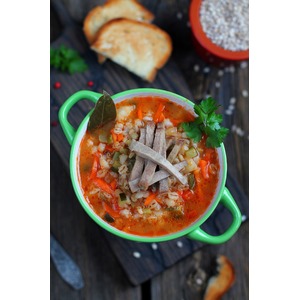 Перловку Мистраль (150-200 гр) промыть и добавить в кастрюлю с горячим бульоном. Варить до полуготовности. Количество перловки зависит от Вашей кастрюли и от желаемой густоты. |